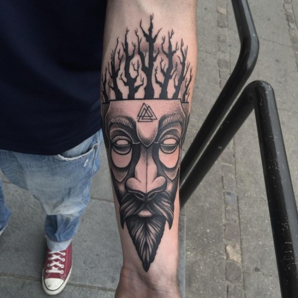 手臂部落风格黑色面具和三角形符号树木纹身图案