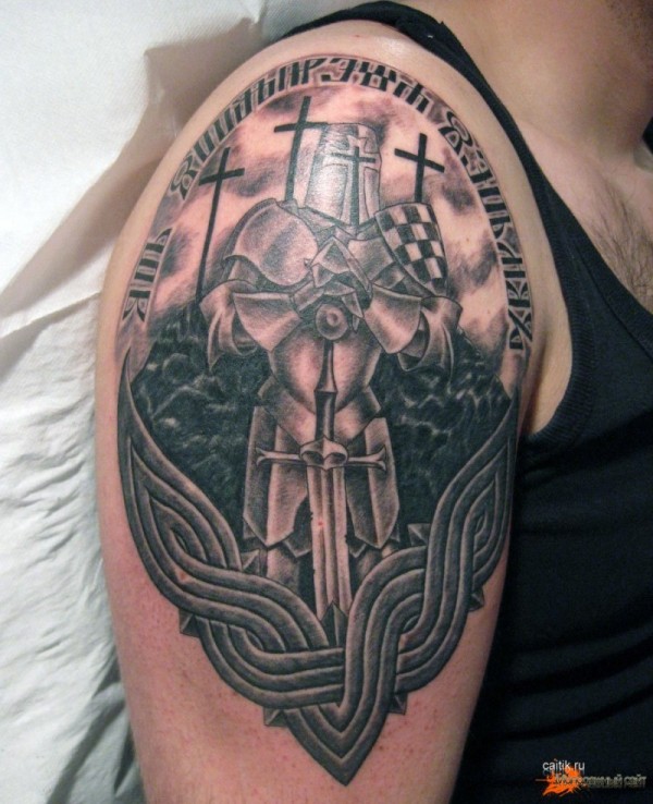 大臂华丽的黑白中世纪骑士凯尔特人纹身图案