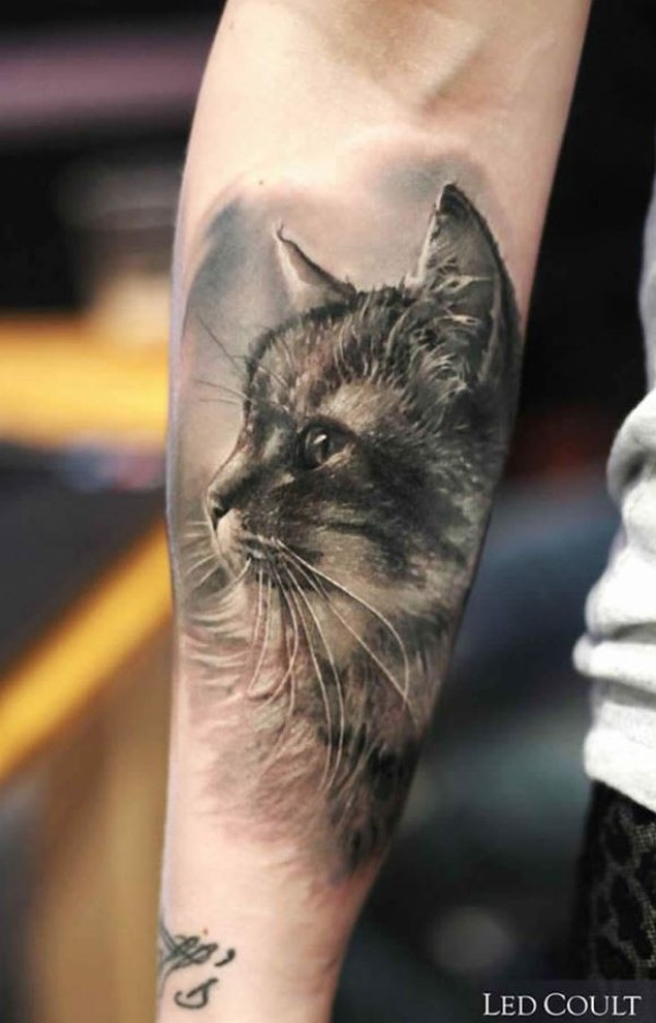 惊人的非常逼真黑灰猫肖像小臂纹身图案