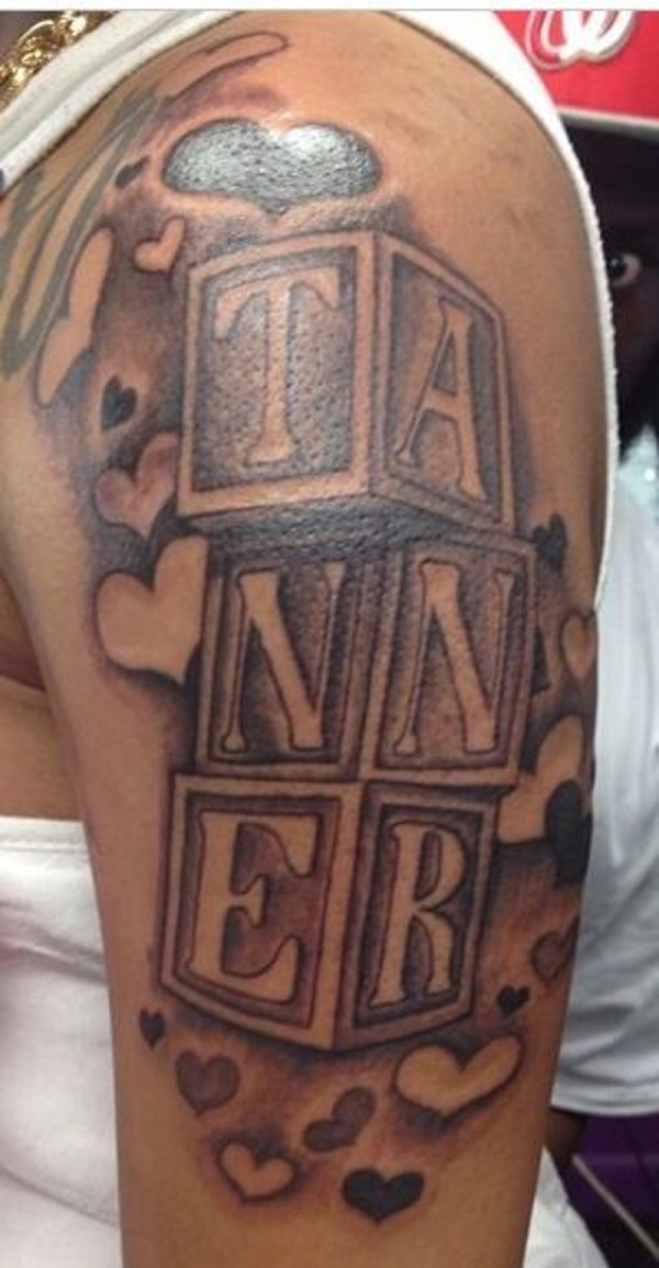 肩部不寻常的黑色立方体与字母心形纹身图案