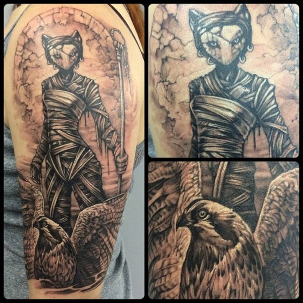 大臂惊人的黑色神秘猫形女巫纹身图案