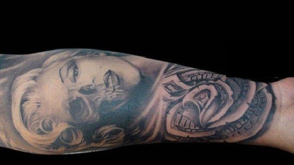 手臂黑灰玛丽莲梦露肖像与玫瑰美元纹身图案