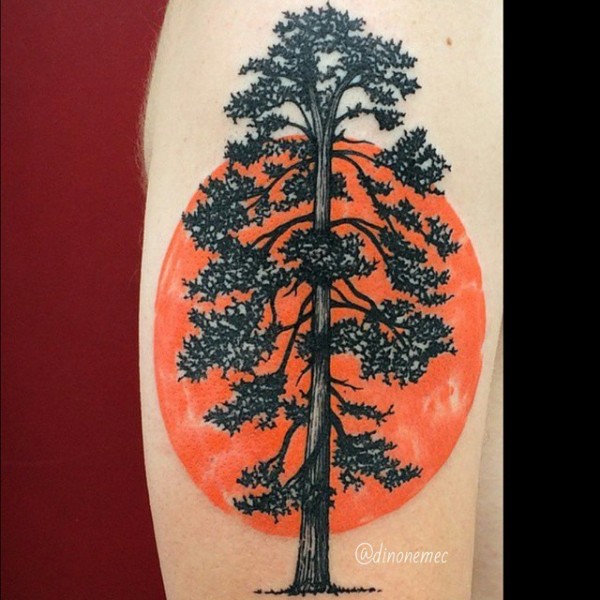 手臂old school黑色孤独大树与橙色太阳纹身图案