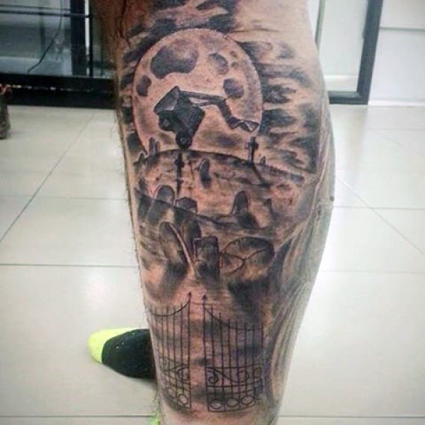 小腿漫画风格黑色月亮幽灵与墓地纹身图案