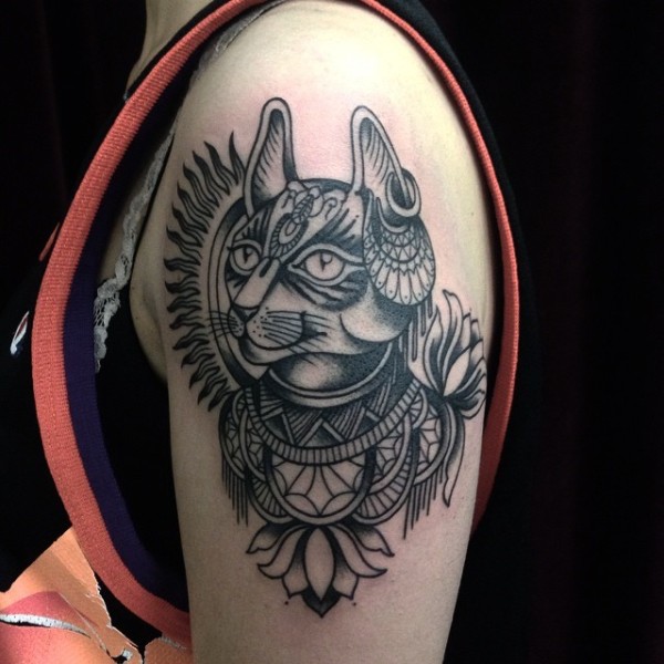大臂old school黑灰埃及猫纹身图案