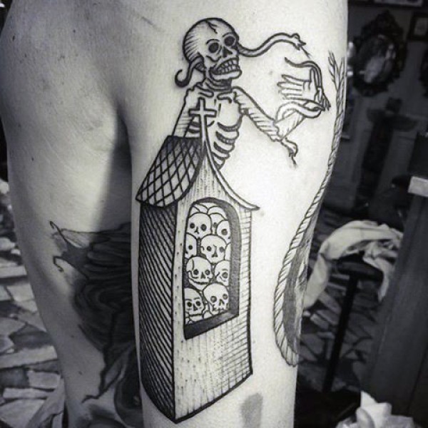 大臂有趣的黑白骷髅与蛇房子纹身图案