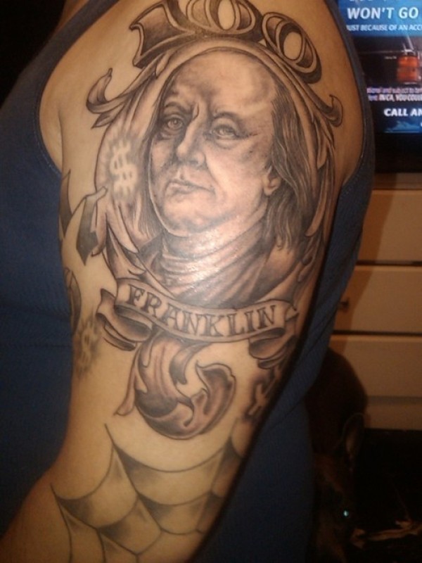 大臂黑色本杰明富兰克林肖像与字母纹身图案