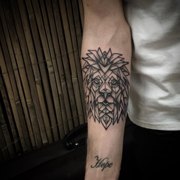 手臂黑色狮子头部几何风格纹身图案