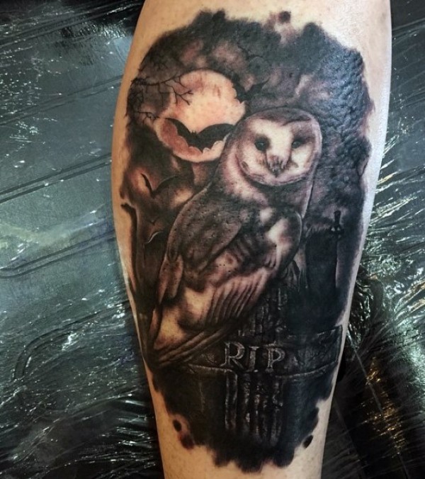 小腿黑白墓地与令人毛骨悚然的猫头鹰纹身图案