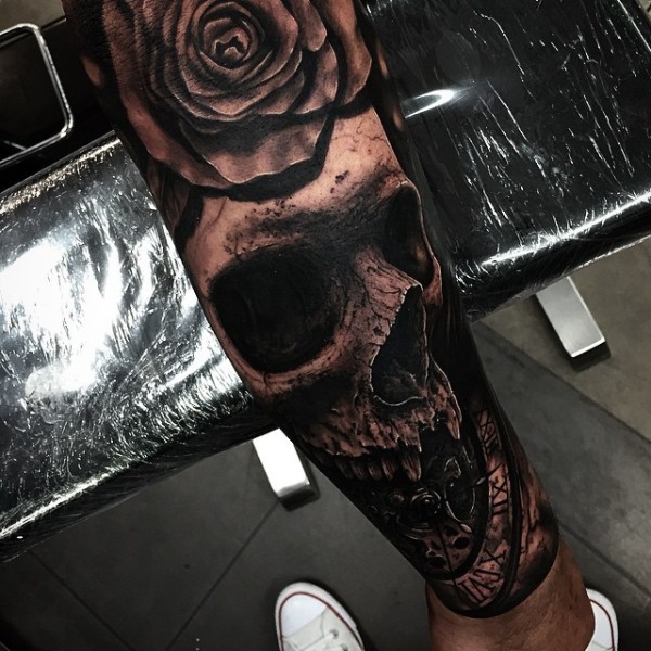 小臂立体逼真的黑色骷髅与玫瑰纹身图案