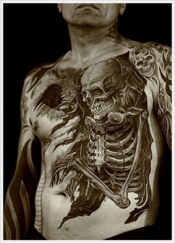 胸部和腹部逼真的黑白骷髅骨架纹身图案