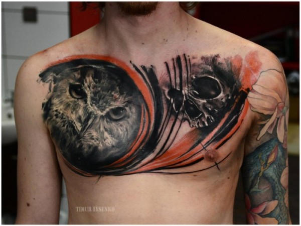 胸部华丽逼真的黑白猫头鹰与骷髅纹身图案