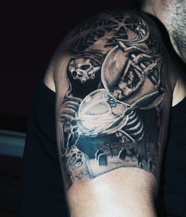 大臂黑色可怕骷髅女巫与墓地纹身图案