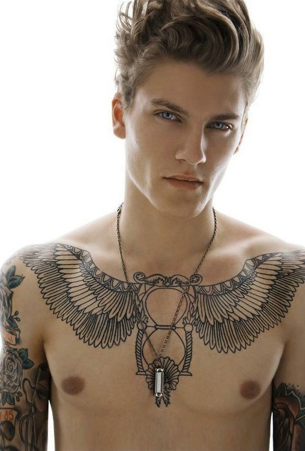 男子胸部巨型羽毛翅膀和沙漏黑色纹身图案