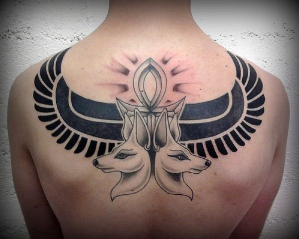 背部有趣的埃及风格黑色翅膀和狗纹身图案