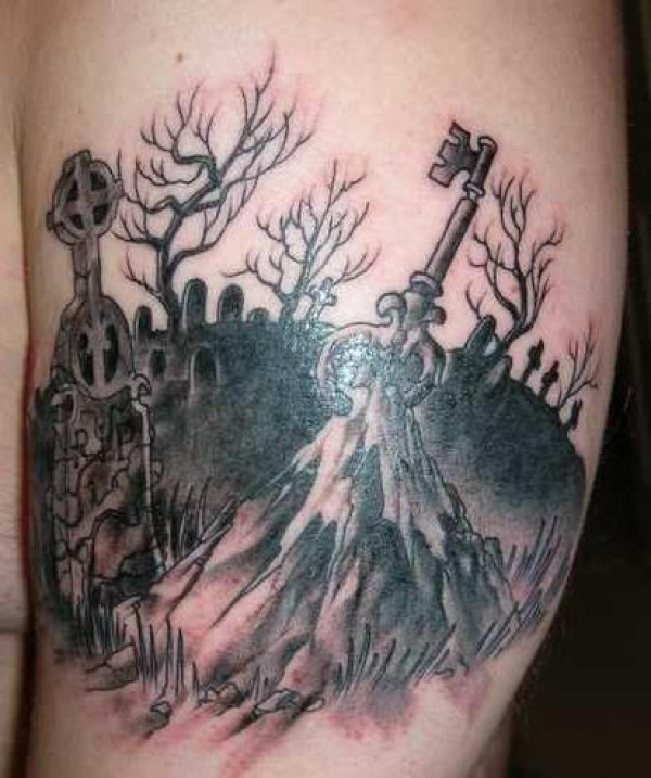大臂黑暗的黑色墓地与神秘钥匙纹身图案