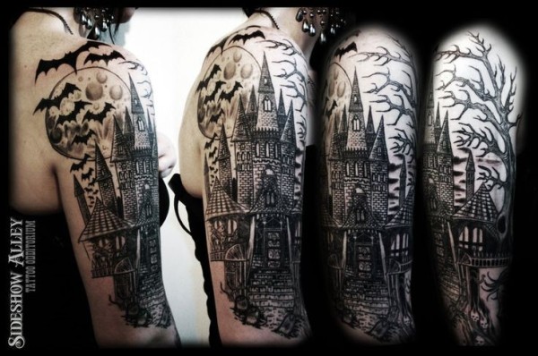 手臂可怕的黑白城堡与蝙蝠纹身图案