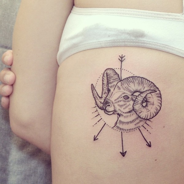 背部有趣的黑色线条山羊头与箭头纹身图案