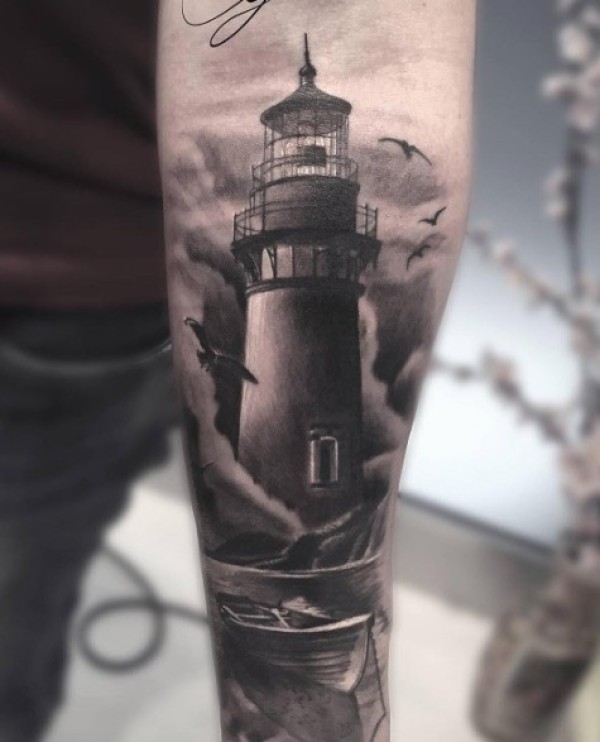 小臂华丽的黑白古老灯塔与船和海鸥纹身图案