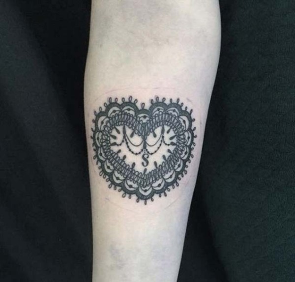 小臂蕾丝装饰黑白心形纹身图案