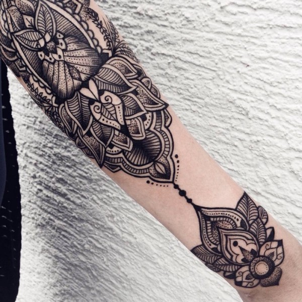 手臂黑色线条点刺巴洛克梵花纹身图案