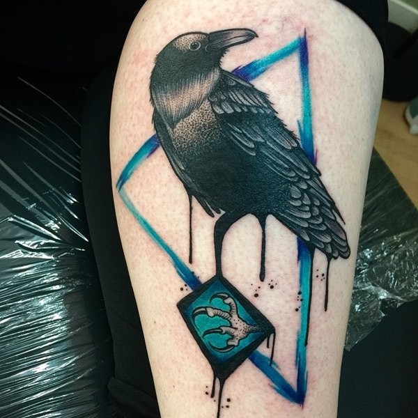 大腿黑色乌鸦与神秘的蓝色三角纹身图案