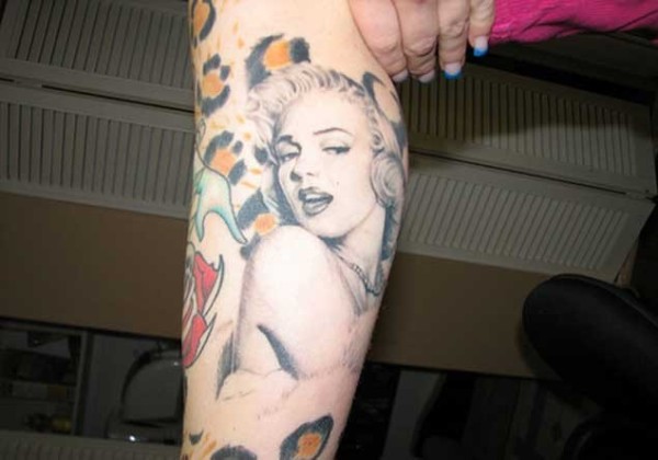 小腿写实黑灰性感玛丽莲梦露肖像纹身图案