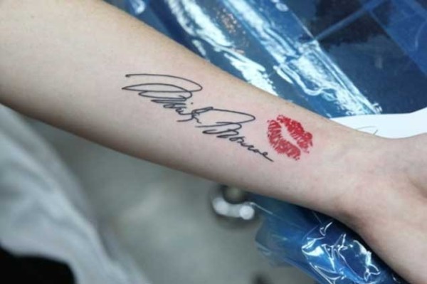 手腕黑色名人签名字母和红唇印纹身图案