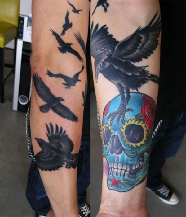 手臂old school墨西哥传统骷髅和黑乌鸦纹身图案