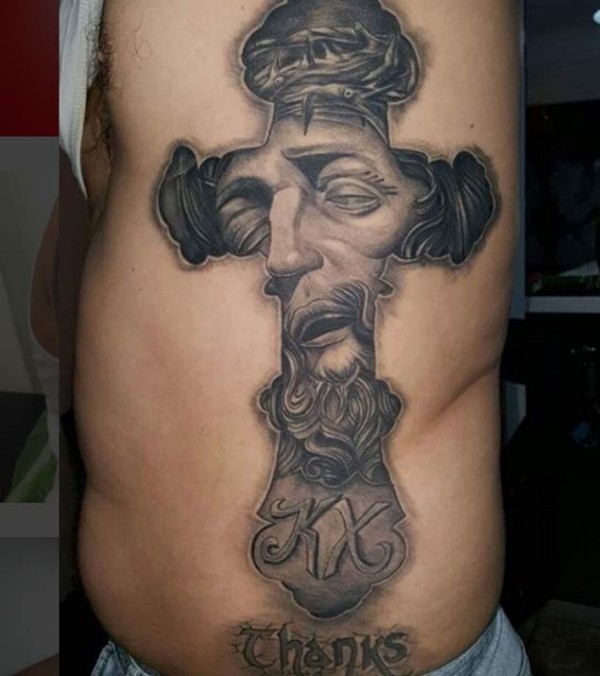 侧肋黑灰十字架与耶稣肖像纹身图案