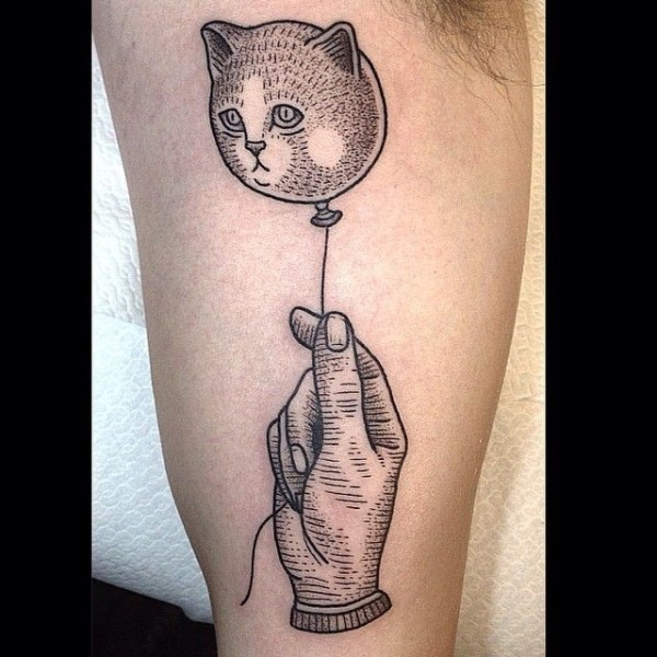 大臂内侧old school黑色线条手猫形气球纹身图案