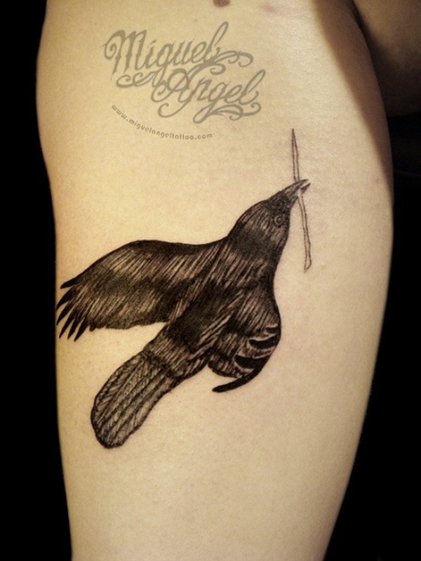 肩部黑色的乌鸦纹身图案
