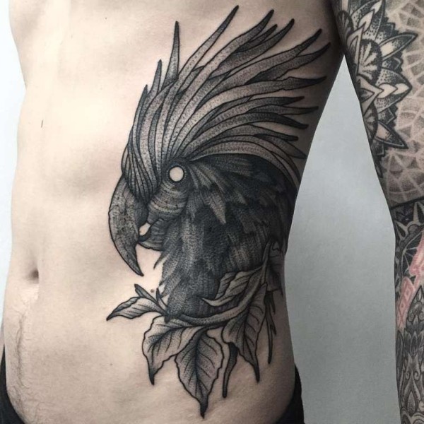 侧肋黑色个性鹦鹉头像和树叶纹身图案