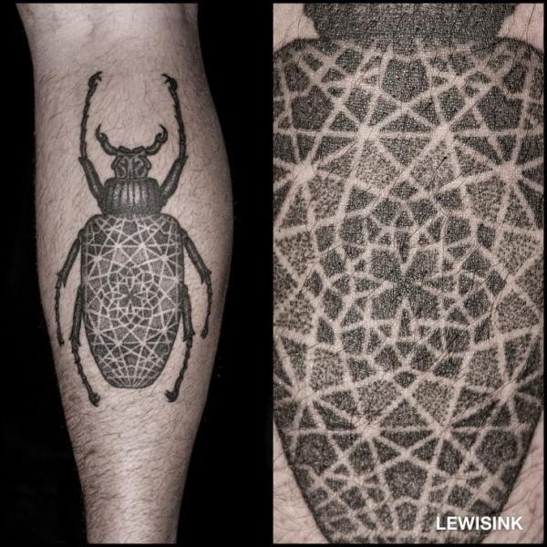 小腿黑色甲虫与部落装饰纹身图案