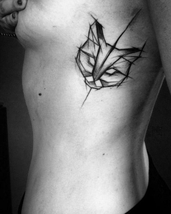 侧肋迷你黑色线条猫素描纹身图案