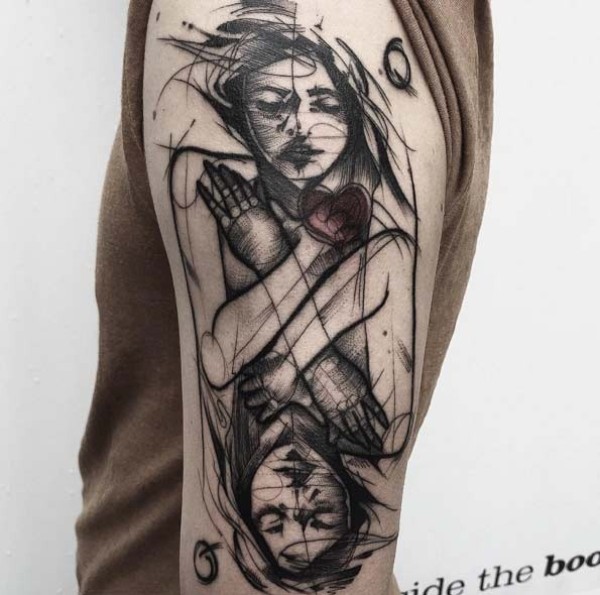 大臂令人难以置信的黑色素描镜子女人纹身图案