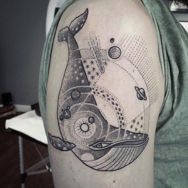 大臂old school黑色点刺鲸鱼与太阳系纹身图案