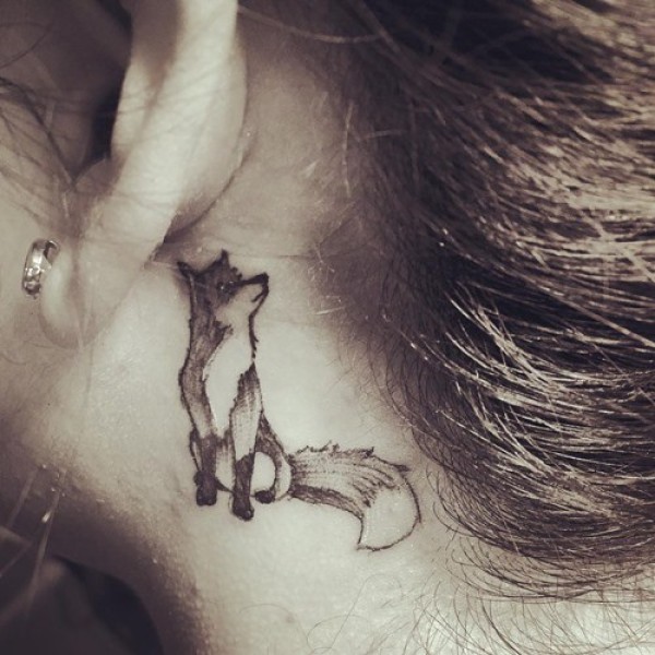 耳朵后滑稽的卡通黑色小狐狸纹身图案