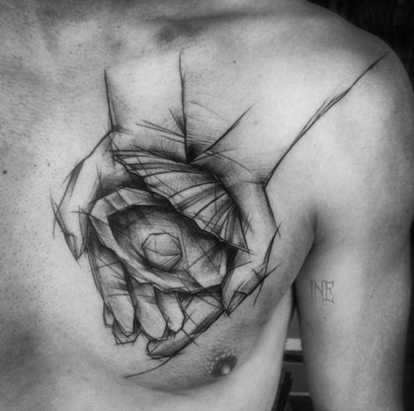 胸部黑色手绘风格手持有贝壳与珍珠纹身图案