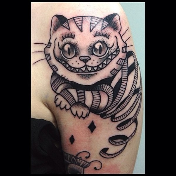 肩部黑白滑稽爱丽丝梦游仙境猫纹身图案