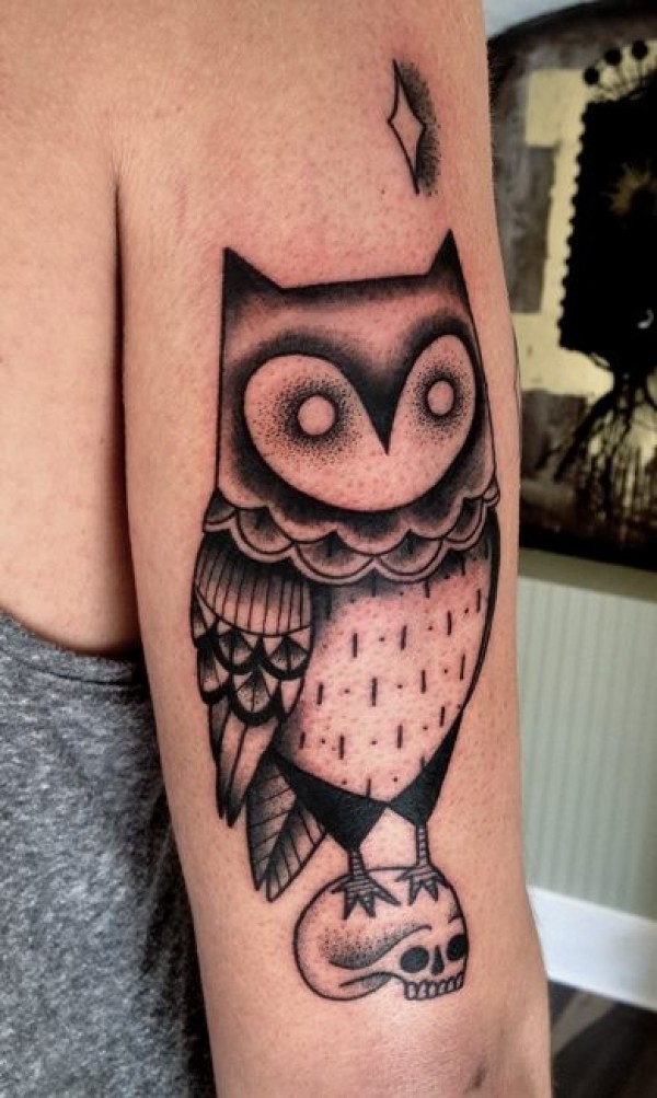 手臂幻想风格黑色头鹰与骷髅纹身图案