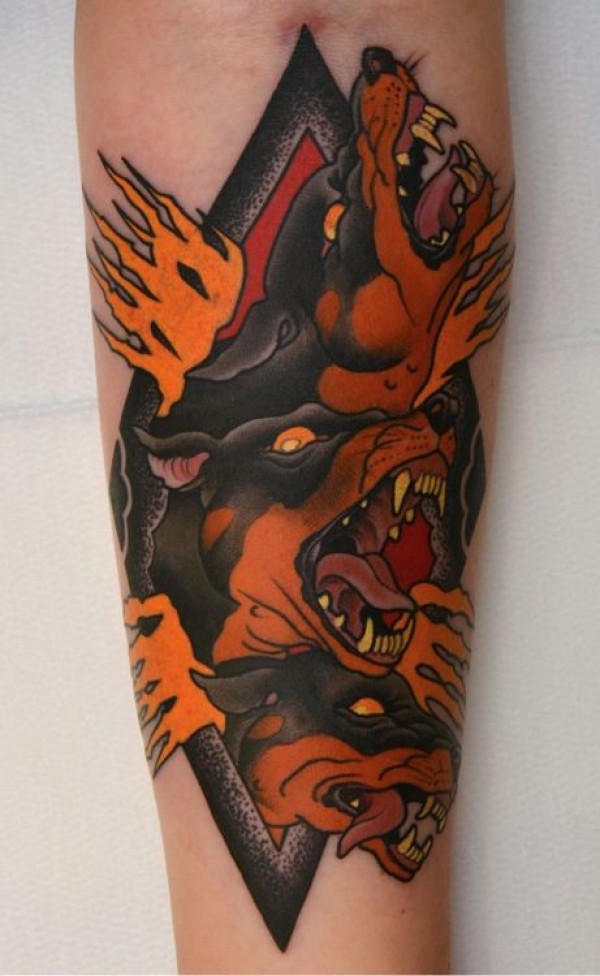 小臂old school黑色地狱狗与火焰纹身图案