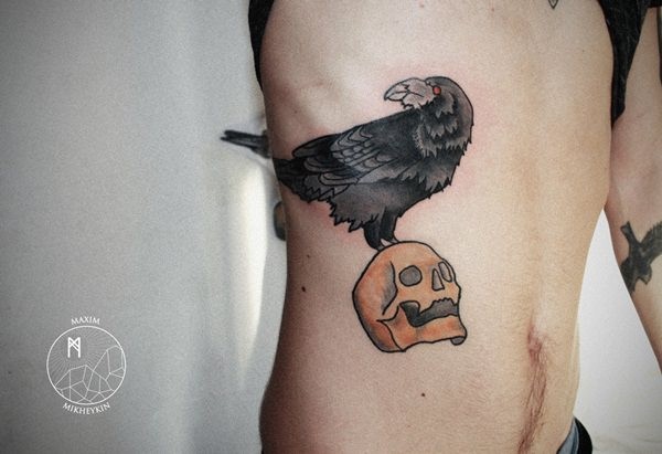 侧肋传统的彩色骷髅与黑乌鸦纹身图案