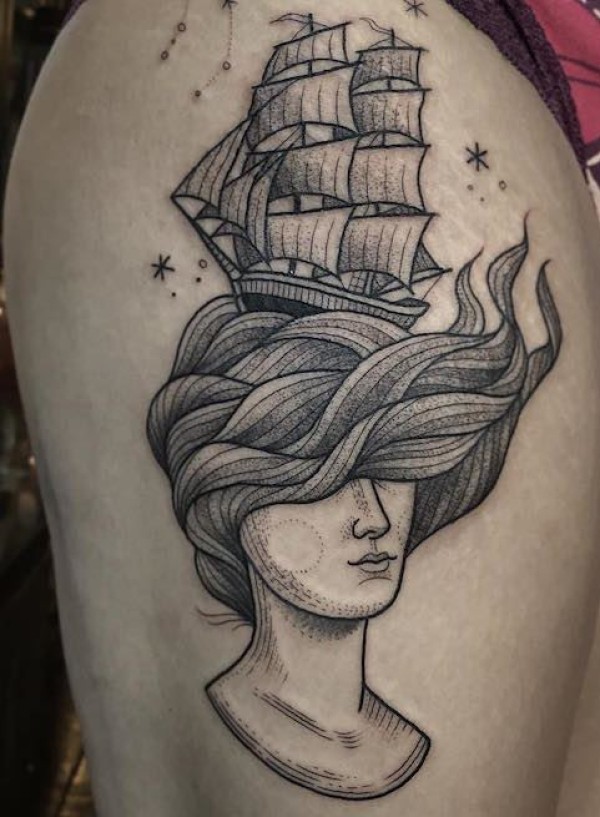 大腿黑色线条点刺神秘女子与帆船纹身图案