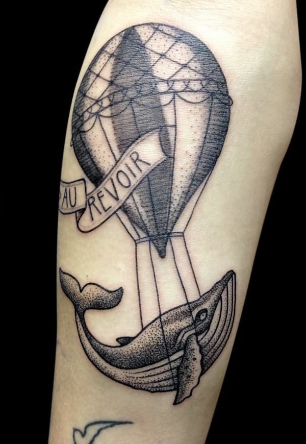 小臂有趣的黑色点刺气球与鲸鱼纹身图案