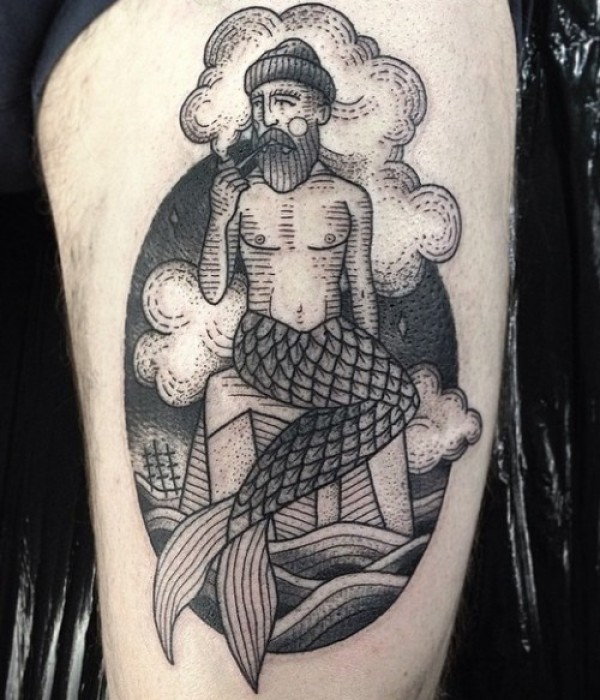 old school黑色滑稽吸烟美人鱼男子纹身图案