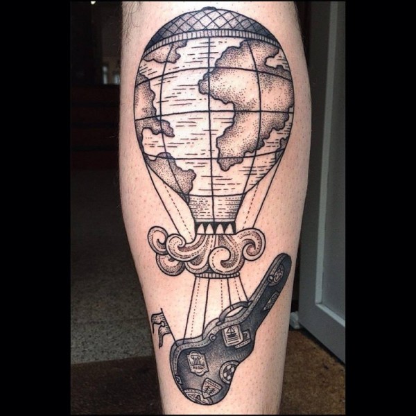 小腿黑色点刺热气球与世界地图和吉他纹身图案