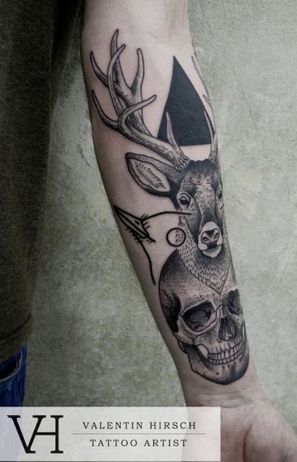 手臂黑色的鹿头骷髅和三角形纹身图案