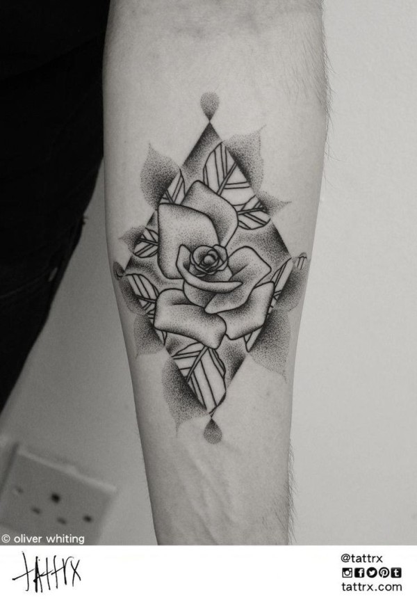 手臂黑灰点刺几何图形与玫瑰纹身图案