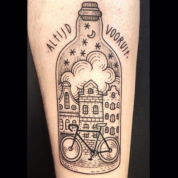 黑点线条点刺瓶子与城市夜间纹身图案